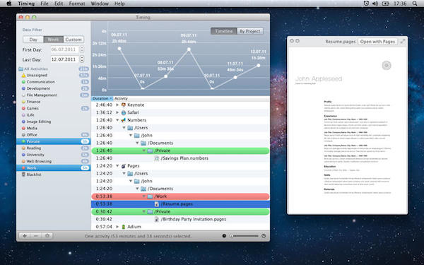 Timing這款軟件能夠統(tǒng)計(jì)用戶在Mac上使用各種應(yīng)用的具體時(shí)間分配,無(wú)需開啟任何計(jì)時(shí)器便可清楚的了解用戶在任何所運(yùn)行過的程序上所花費(fèi)和消耗掉的具體時(shí)間,包括正在編輯的文件,正在使用的程序以及正在登陸的網(wǎng)頁(yè)等,而這一切都是在后臺(tái)自動(dòng)完成,您再也不用擔(dān)心忘記再次啟動(dòng)或是停止計(jì)時(shí)器。【軟件特點(diǎn)】