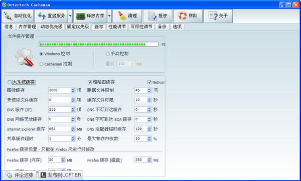 緩存優(yōu)化工具,在windows上有一個最大的缺點那就是它磁盤緩存管理的策略,如果所有的RAM都被使用了,Windows就開始使用虛擬內(nèi)存,而不是重新補充已經(jīng)耗盡的磁盤緩存,而這款軟件就可以幫助用戶輕松解決這些問題。