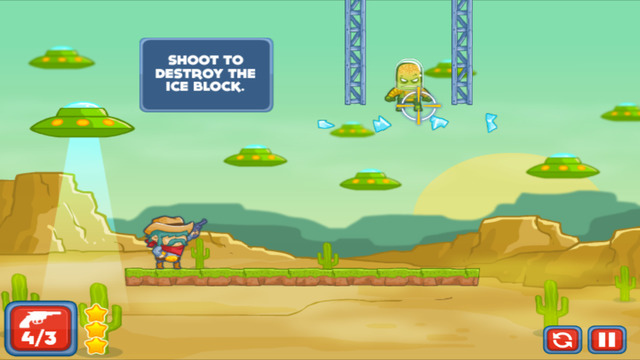 《牛仔對戰(zhàn)外星人 Cowboy vs Martians》是一款非常有趣休閑益智游戲。玩家需要控制自己射擊的方向?qū)⑼庑侨讼麥?,游戲操作很簡單,點擊屏幕可以選擇方向,點擊左下方的按鈕即可射擊,使用越少的子彈完成關卡獲得的評價就會越高。游戲關卡到了后期還會出現(xiàn)各種不同的障礙和道具,比如需要多次射擊才能破壞的障礙,可以引爆破壞周圍物品的道具等。是不是很有意思,喜歡的玩家趕快下載體驗吧。【游戲背景】