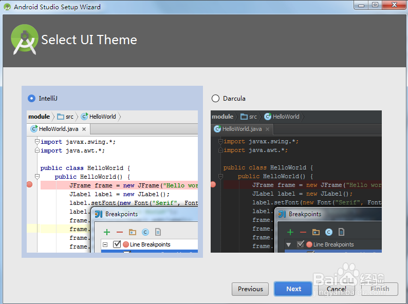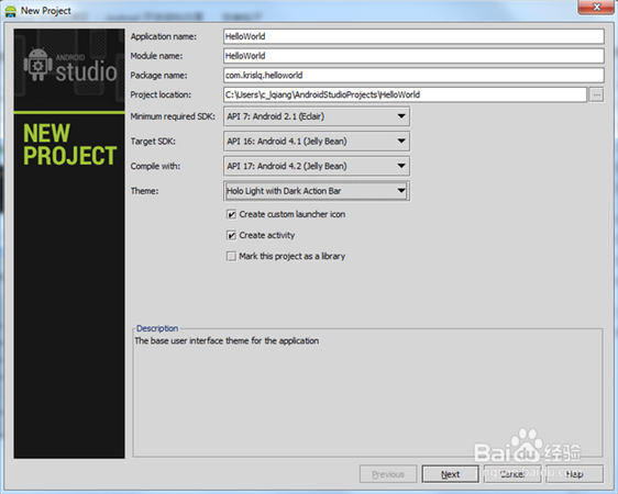 5、我們還是從Helloword開始吧,我們選擇New project,然后出現的界面如圖所示和eclipse創(chuàng)建項目差不多,輸入項目名,選擇編譯環(huán)境,然后亮點就是可以選擇theme了,還是挺不錯的。