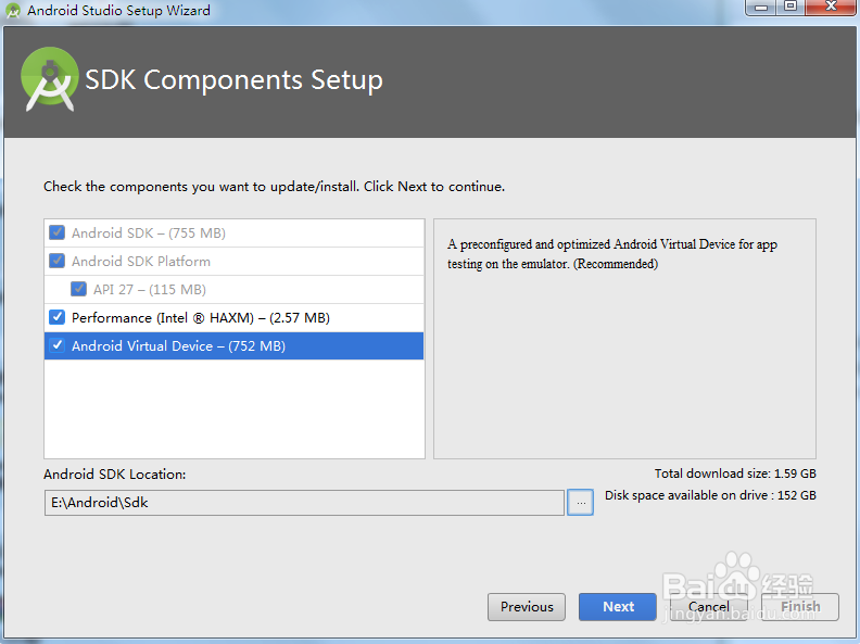 Android Studio是必須安裝的,Android Virtual Device可裝可不裝,這是模擬器,也有很多其他好用的模擬器,如:夜神模擬器和geneymotion模擬器等。