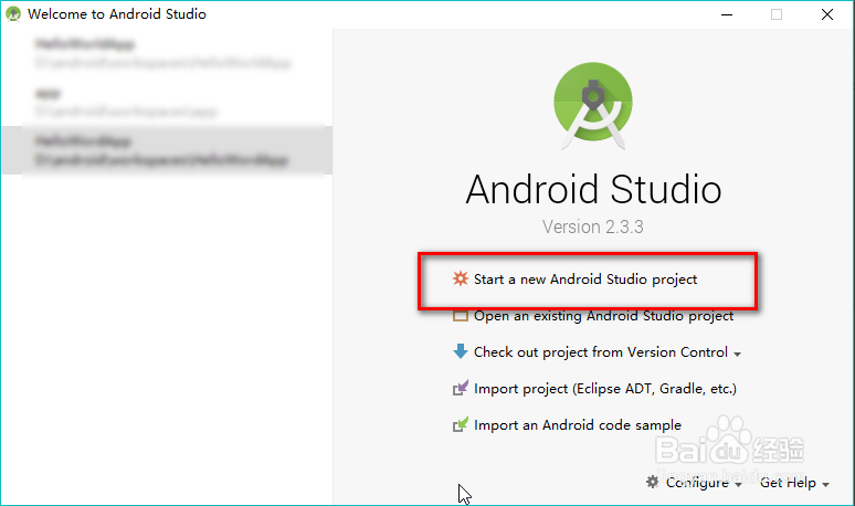 打開AndroidStudio,點擊“New Project”或“Start a new Android Studio project”。