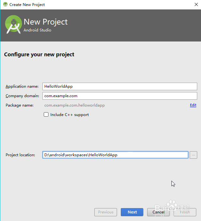 輸入工程名稱,公司域名,設置好工程路徑,接著點擊“下一步”。其中設置好公司域名之后,默認的包名就會按照以“公司域名+工程名”命名,如果你不喜歡這樣的包名,可以點擊“Edit”修改。