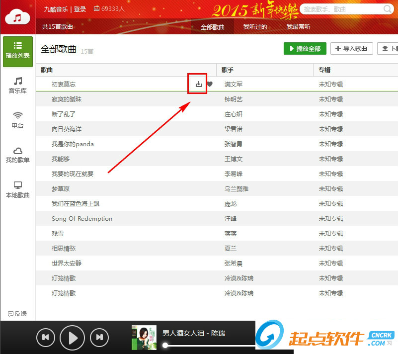 1、如果大家是是下載播放列表里面的歌曲那么我們可以將鼠標(biāo)移到歌曲上點(diǎn)擊下載符號