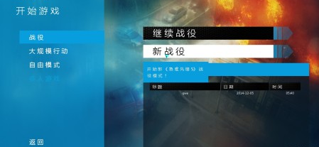 我們首先來看看開始游戲,點(diǎn)擊開始游戲之后,我們會進(jìn)入下一個菜單,這里有5個選項,分別是戰(zhàn)役,大規(guī)模行動,自由模式,多人游戲和退出..