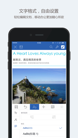 WPS Office iOS版文字模塊現(xiàn)具備更多編輯功能,從字體到段落,靈活編輯。文字模塊提供了相當(dāng)豐富的自定義字體選擇,你可以根據(jù)文檔內(nèi)容或者自己的喜好選擇合適的字體,調(diào)節(jié)字體大小,改變字形,為字體配色。你還可以自由調(diào)整段落樣式。讓選擇文字對齊方式,插入并選擇項目符號,調(diào)整段落縮進方法,規(guī)整行距,都變得十分容易。