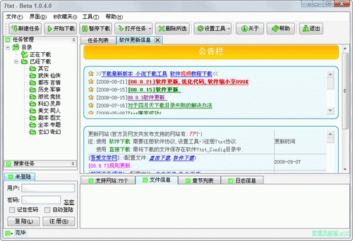 TXT小說下載工具,是由7txt歷時(shí)三年更新完成的一套完全免費(fèi),多功能的下載網(wǎng)絡(luò)資源工具(暫時(shí)主要針對(duì)小說TXT),其支持的各類(小說,資源)網(wǎng)站靈活多變,可下載率高達(dá)99%以上,軟件更新頻率超越任何同類產(chǎn)品。