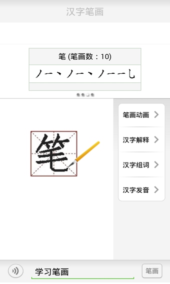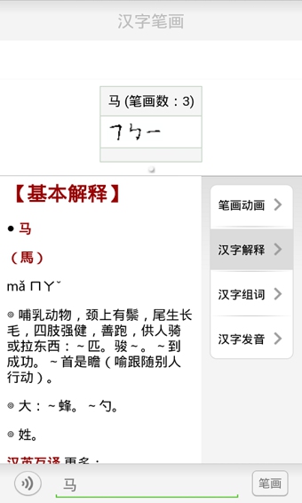 由于信息技術(shù)的發(fā)展,人們已經(jīng)習(xí)慣于在電腦、平板電腦及手機(jī)上打字,而大部分人已經(jīng)忘記漢字最基本的書寫筆畫及順序,本款軟件可以輕松搜索漢字的書寫筆畫和筆順,通過對每個漢字每個筆畫的拆解分析,使用戶了解筆畫順序,在此軟件中還增加動畫書寫筆畫功能,更加生動形象的描繪每個漢字的筆畫、筆順和精髓。該軟件的主要目的是幫助剛剛起步學(xué)漢字的小學(xué)生和老外了解每個漢字的書寫順序,為學(xué)習(xí)漢字打下扎實(shí)的書寫基礎(chǔ)。【更新日志】