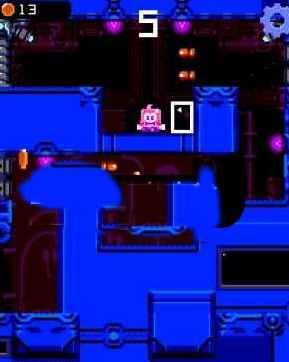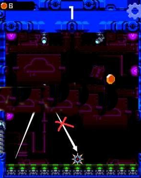 2、在下圖中畫面?zhèn)z邊會有數(shù)發(fā)子彈橫向穿過,小人必須在子彈剛去后的第一時間跳上臺階才可以躲避下一發(fā)子彈,因此我們需要靠近墻壁,這就需要我們一直保持在下圖所示位置,我們可以等小人撞擊右邊墻壁向左移動時,馬上向右滑動屏幕,讓小人保持在墻壁旁邊。