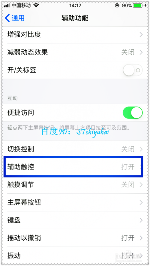 進(jìn)入通用設(shè)置界面后找到輔助功能設(shè)置一欄,點(diǎn)擊進(jìn)入輔助功能界面,找到AssistiveTouch,新版本已經(jīng)改名為“輔助控制”。