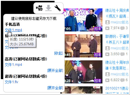1、在優(yōu)酷和土豆的頁面顯示下載按鈕,可以很方便的下載優(yōu)酷、土豆的視頻,還有一些分辨率可選。