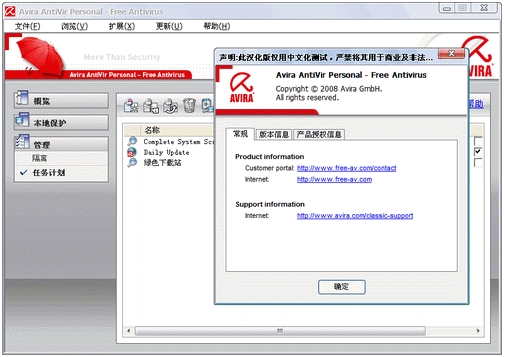 Avira AntiVir Personal V8 曉月漢化修正版 AntiVir是Avira公司推出的殺毒軟件,功能很全面,殺毒迅速準確,獲過很多獎項.Avira Premium Security Suite是Avira推出的面向個人用戶的收費版本,該套裝包括了AntiVir(防病毒木馬)、AntiSpam(反垃圾郵件)、AntiRootkit(Rootkit監(jiān)控)、Firewall(防火墻)等等模塊,該有的功能都有了,體積也算是很小巧.