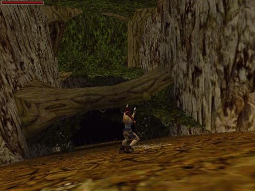第一個(gè):就在游戲開始時(shí)LARA左前方的大石頭下面。先跳到右邊綠色平臺(tái)上再朝著大石頭底部的方向跳。里面可是一把SHORTGUN哦!游戲前期超牛,2槍打死一只老虎。