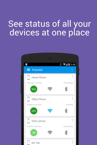 Potential安卓版是一款安卓手機(jī)的多設(shè)備交互應(yīng)用。通過一臺設(shè)備你可以查看另外的設(shè)備的WiFi、藍(lán)牙和電量的狀態(tài),這樣的話你就能及時(shí)的了解到你的設(shè)備的信息,比方說你有一臺手機(jī)忘記充點(diǎn)了,電量不足,這款Potential應(yīng)用就會顯示并提醒你,你有一臺設(shè)備需要充電。