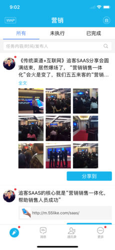 追客app是上海五五來客科技股份有限公司的移動(dòng)營(yíng)銷產(chǎn)品,是一款致力于“幫助企業(yè)實(shí)現(xiàn)全員營(yíng)銷”的SAAS工具,通過手機(jī)版宣傳冊(cè)、營(yíng)銷任務(wù)分發(fā)、自營(yíng)銷管理、營(yíng)銷成果管理、營(yíng)銷排行榜等功能模塊,集多平臺(tái)于一體的全網(wǎng)系統(tǒng)。追客app是全球第一款以“讓銷售無處不在”為指導(dǎo)思想,以“移動(dòng)營(yíng)銷”為方法,提升銷售業(yè)績(jī)的工具,通過營(yíng)銷工具輔助、員工營(yíng)銷積極性調(diào)動(dòng),以及客戶拓展方式優(yōu)化,來幫助企業(yè)最終達(dá)到提升銷售業(yè)績(jī)的目的。