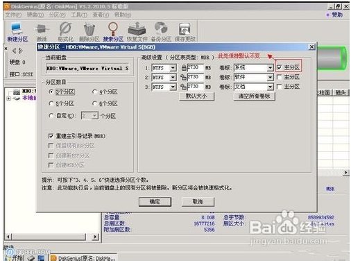 4、選擇所需要分區(qū)的數(shù)目或手動(dòng)選擇硬盤分區(qū)數(shù)目,并“重建引導(dǎo)記錄”保持不變。