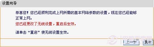 設(shè)置完成后,單擊下一步,如果您更改了無線設(shè)置,將彈出如下圖所示的設(shè)置向?qū)瓿山缑?,單擊重啟使無線設(shè)置生效。