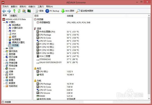 AIDA64打開界面,進入主界面可以看到較多項目,用于檢測本機硬件參數型號等,這里我們點擊計算機——傳感器,可以看到本機的CPU,硬盤,南橋的實時溫度及其他數據。其專業(yè)性遠超魯大師。