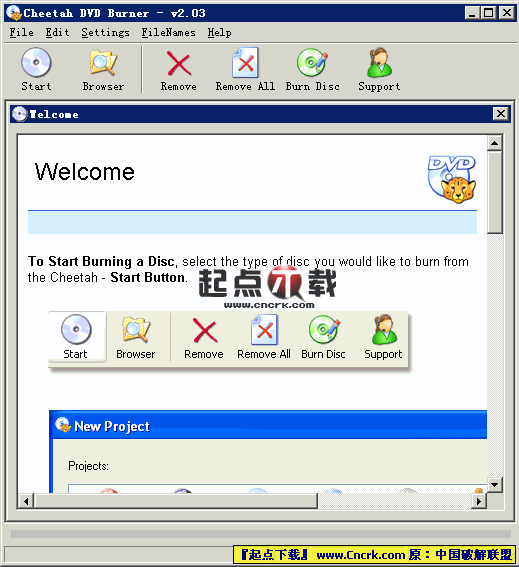 Cheetah DVD Burner v2.03 特別版 Cheetah.DVD.Burner可以刻錄雙層DVD+R, DVD+RW, DVD+R, DVD-RW, DVD-R, DVD-RAM, CD-RW和CD-R,你也可以用它刻錄啟動光盤,光盤鏡像,以及由Mp3、Mp2、WMA、WAV、AVI、OGG文件直接刻錄音頻CD。 Cheetah.DVD.Burner同時還包含一個CD抓軌工具和其他許多有用的工具。