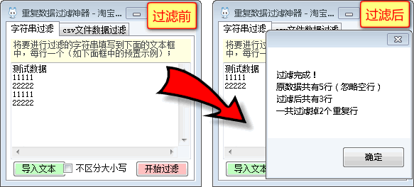 1.假如你采集了很多郵箱、淘寶買(mǎi)家?guī)ぬ?hào)、QQ帳號(hào),或其它類(lèi)似的帳號(hào)、ID等信息,但里面有很多重復(fù)的數(shù)據(jù),手工去除那太慢太煩容易出錯(cuò),那么你應(yīng)該用淘寶神器之重復(fù)數(shù)據(jù)過(guò)濾神器來(lái)過(guò)濾重復(fù)的數(shù)據(jù)(只保留一次)。2.1本軟件支持字符串過(guò)濾,也支持對(duì).csv文件直接過(guò)濾。