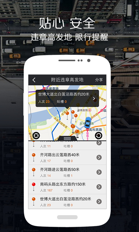 【貼心】查詢附近的違章高發(fā)地,讓您對(duì)周圍的違章狀況了如指掌;