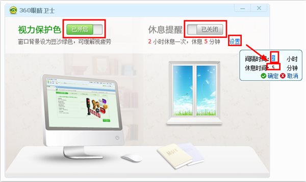 3、左邊是視力保護(hù)色開關(guān),右邊是休息提醒可以自動設(shè)置休息的時間間隔,簡單明了。
