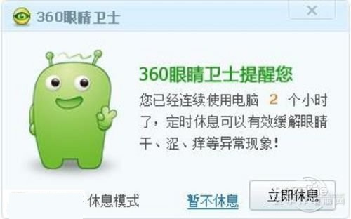 5、當(dāng)?shù)搅嗽O(shè)定的休息時間,360眼睛衛(wèi)士的安仔會自動彈出讓你休息,當(dāng)然,如果手頭真的有非常必要的事情可以選擇暫不休息。當(dāng)點(diǎn)擊立刻休息,則會跳出一款Q版眼睛保健操演示圖,可謂讓人重溫了兒時的記憶,每天課間那清脆的聲音:“眼保健操,現(xiàn)在~開始~~第一節(jié),按揉睛明穴”……