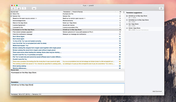 Poedit Mac版是Mac os平臺撒很難過的一款.po文件編輯器,poedit Mac版常用來漢化各種程序,它內(nèi)置于wxWidgets工具中,可以在所有它支持的平臺上運行,如Unix下的GTK+以及Windows。PoEdit提供更方便的辦法編輯目錄,而不用通過啟動VI文本編輯器,手動編輯。【使用方法】