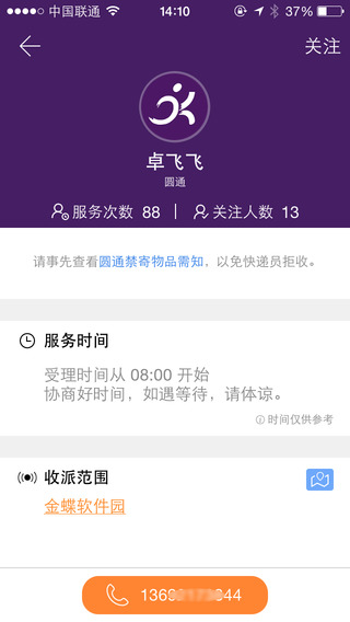 1.查看你附近的快遞員的業(yè)務(wù)信息;2.通過電話預(yù)約快遞員的方式寄快遞;(iPad 與 iPod 設(shè)備不支持撥打電話)