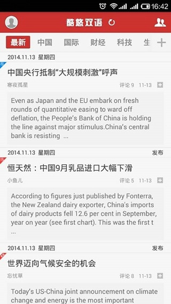 酷悠雙語閱讀是一款專為英語愛好者提供的雙語閱讀軟件,擁有國內(nèi)、國際、財(cái)金、生活、社會(huì)等多個(gè)新聞板塊,全部都是中英文雙語顯示方式,方便用戶獲得更加優(yōu)質(zhì)的閱讀體驗(yàn)。