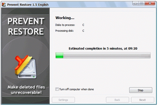 Prevent Restore為徹底刪除這些文件而設(shè)計,用戶可以選擇一個想要刪除的文件,選刪除格式,它會立刻執(zhí)行。有一些使用安全算法的刪除方式可以使用,這些被刪除的文件不能被恢復(fù)