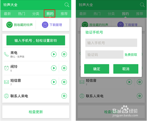 點(diǎn)擊導(dǎo)航欄中【 我的 】可以進(jìn)入下載管理、和以往收藏過(guò)的鈴聲,