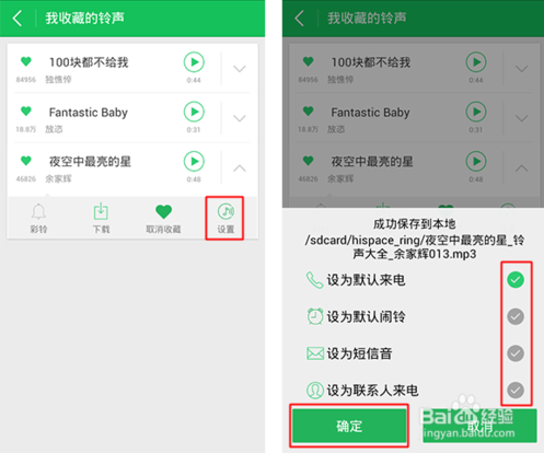 從收藏夾里設(shè)置鈴聲,和以上步驟相同,但設(shè)置為鈴聲后,會(huì)默認(rèn)下載鈴聲到本地。