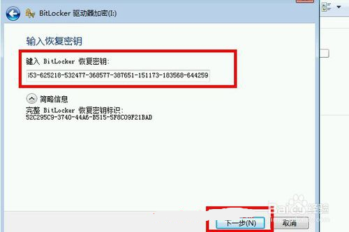 5、把恢復(fù)秘鑰粘貼到bitlocker的窗口點擊恢復(fù)即可。