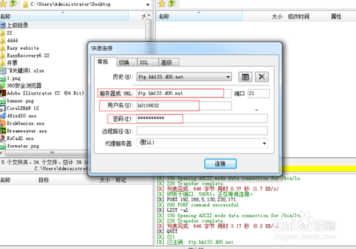 主要輸入3個內(nèi)容,服務(wù)器地址、用戶、密碼。端口默認(rèn)為21,一般不用修改。