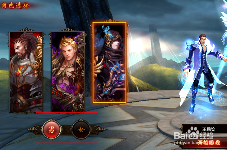 稍等一下,緩沖進入游戲界面,創(chuàng)建角色,有三種職業(yè)供你選擇,男女兩種性別,創(chuàng)建完游戲角色之后進入游戲。