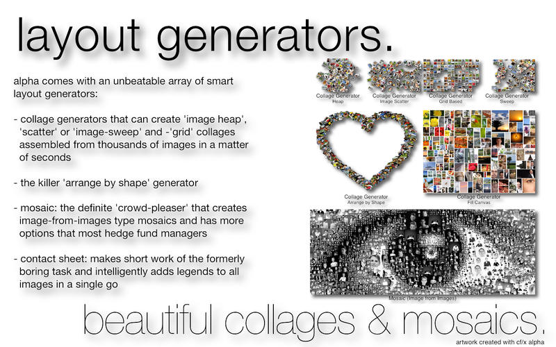 阿爾法的拼貼生成器可以創(chuàng)建一個“形象堆',一個'散'或圖像,'Sweep'和-'Grid”,并在幾秒鐘內(nèi)組裝超過1000的圖像 - 它也能“形”安排拼貼。當然,它包含了萬人空巷先進的馬賽克(圖片 - 從 - 圖像)發(fā)生器,是如此受歡迎,它催生了它自己的應(yīng)用程序。