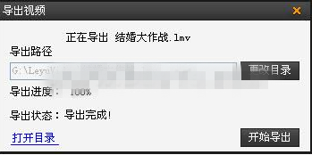 例如,選擇影片《結(jié)婚大作戰(zhàn)》觀看,等播放控制欄的緩沖進(jìn)度完成后,在播放畫面點擊鼠標(biāo)右鍵,選擇“導(dǎo)出視頻”按鈕,在彈出的窗口中點擊“開始導(dǎo)出”,幾秒鐘后緩沖文件會導(dǎo)出完成,點擊“打開目錄”,在本地最大磁盤空間下“LeyuVideo”文件夾中就會出現(xiàn)后綴為“l(fā)mv”的緩存文件,雙擊該文件就能享受如在本地硬盤播放影片一樣的播放效果了。