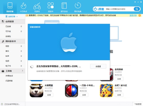 如果出現(xiàn)軟件或游戲安裝失敗,請首先確認(rèn)蘋果設(shè)備是否與電腦連接正常,正常時歡迎頁可顯示設(shè)備信息。