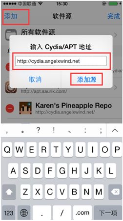 2、點擊左上角“添加”,輸入”cydia.angelxwind.net”,點擊“添加源”