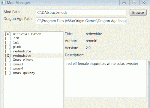 2.選擇MOD文件夾,點(diǎn)擊“merge(合并)”按鈕,第一次安裝MOD會(huì)彈出一個(gè)窗口,問你package.mft的保存位置,請(qǐng)?jiān)贒ragon Age Inquisition\Update里選擇(例如:C:\Program File\Origin\Origin Games\Dragon Age Inquisition\Update\Mods)