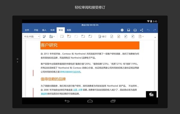 專(zhuān)為Android平板電腦設(shè)計(jì)的MicrosoftWord應(yīng)用。Word文檔在A(yíng)ndroid平板電腦上看起來(lái)比以往更美觀(guān)。您所創(chuàng)建或編輯的文檔在電腦、Mac、平板電腦和手機(jī)上都能如您所想精美呈現(xiàn),您大可放心。Word具有熟悉的Office外觀(guān)與直觀(guān)的觸控體驗(yàn),讓您立刻輕松上手。