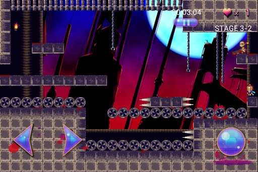 游戲分為挑戰(zhàn)、練習、瘋狂三種模式。除了通關挑戰(zhàn)模式之外,付費也可以直接解鎖瘋狂模式,當然前提是玩家愿意接受這個精神上的虐待。灼熱的地獄、突然墜落的鐵球以及尖刺林立的陷坑無時無刻不考驗著大家的操作,而游戲中通過“死亡”來獲得經驗的諷刺設定也與超高的關卡難度交相呼應。