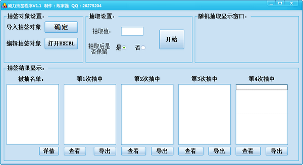 威力抽簽程序非常具有靈活性的電腦抽簽軟件,它基于excel表格設(shè)計(jì),方便管理員管理抽簽名單,軟件自動(dòng)隨機(jī)抽取,自動(dòng)統(tǒng)計(jì),是統(tǒng)計(jì)人員所喜歡的自動(dòng)抽簽軟件。