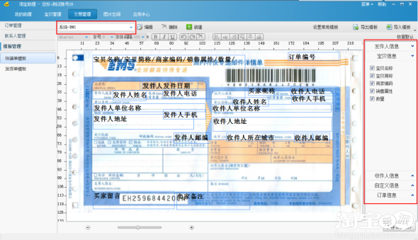 1、選擇“模板管理-快遞單模板”,選擇設(shè)置的快遞模板,左側(cè)欄中可以選擇打印的信息內(nèi)容,模板中可以自由移動信息打印的位置和大小,設(shè)置完成后點擊保存按鈕