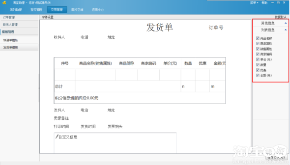 2、選擇“模板管理-發(fā)貨單模板”,左側(cè)欄中可以勾選打印的信息內(nèi)容,設(shè)置完成后點擊保存按鈕