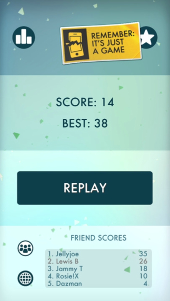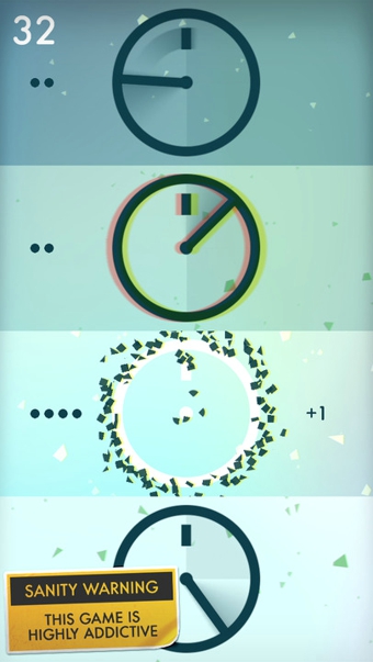 正午.NOON.,中午12點(diǎn)時(shí)按停時(shí)鐘即可得分?!?NOON.》可以說(shuō)是時(shí)鐘版的《一個(gè)都不能死》,玩家要做的是當(dāng)瘋狂旋轉(zhuǎn)的指針指向12點(diǎn)時(shí),按動(dòng)時(shí)鐘鐘面得分。最初只有2面時(shí)鐘,得分高了之后會(huì)增加到三面、四面。而且指針不光會(huì)順時(shí)針旋轉(zhuǎn),有時(shí)候還會(huì)出其不意的逆時(shí)針旋轉(zhuǎn),很是讓人頭疼。別的且不說(shuō),光是瘋狂旋轉(zhuǎn)的樣子看著就讓人頭暈,但為毛還是忍不住想玩下去挑戰(zhàn)高分???