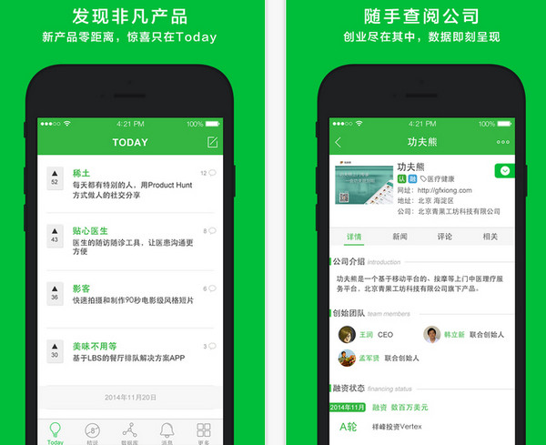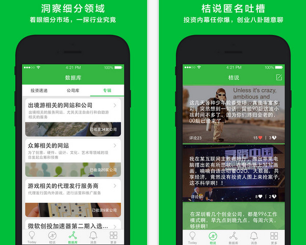 【TODAY】:新產(chǎn)品分享社區(qū)。在這你能發(fā)現(xiàn)分享最新最酷的產(chǎn)品;和圈內(nèi)人士交換你獨特的產(chǎn)品見解;邂逅投資人、開發(fā)者、種子用戶【桔說】:屬于創(chuàng)投人的匿名社交。創(chuàng)投行業(yè)水很深,在“桔說”八卦行業(yè)內(nèi)幕,吐槽名人大佬,預(yù)測未來趨勢,說出那些平時想說卻不方便說的話