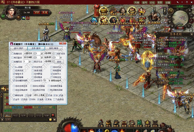 自動除魔任務、自動挖礦任務、自動每日副本、自動封魔任務、Esc回城、攻擊變色、自動反擊、近身抗拒、急速法盾、智能雷電、智能半月、定向野蠻、近身烈火、自動施毒、自動隱身、自動召喚寶寶、自動魔防物防、自動治愈術(shù)、自動主線任務、自動合成裝備、自動換好裝備、自動召喚戰(zhàn)神、自動購買雙倍、自動購買隨機回城、瞬移拾取、自動過濾、飛撿極品。