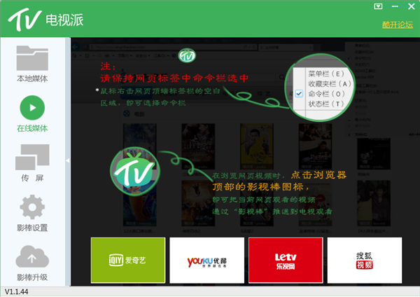 在線媒體推送,主要通過瀏覽器插件的方式(請先安裝插件,方法詳見:插件安裝說明.txt),獲取在線媒體的網(wǎng)址后推送到影棒播放。點(diǎn)擊在線媒體,根據(jù)引導(dǎo)界面提示,將命令欄選中,之后點(diǎn)擊底下視頻網(wǎng)站鏈接,進(jìn)入網(wǎng)站選擇要觀看的視頻,點(diǎn)擊命令欄的電視派按鈕,即可將視頻推送到電視大屏播放。